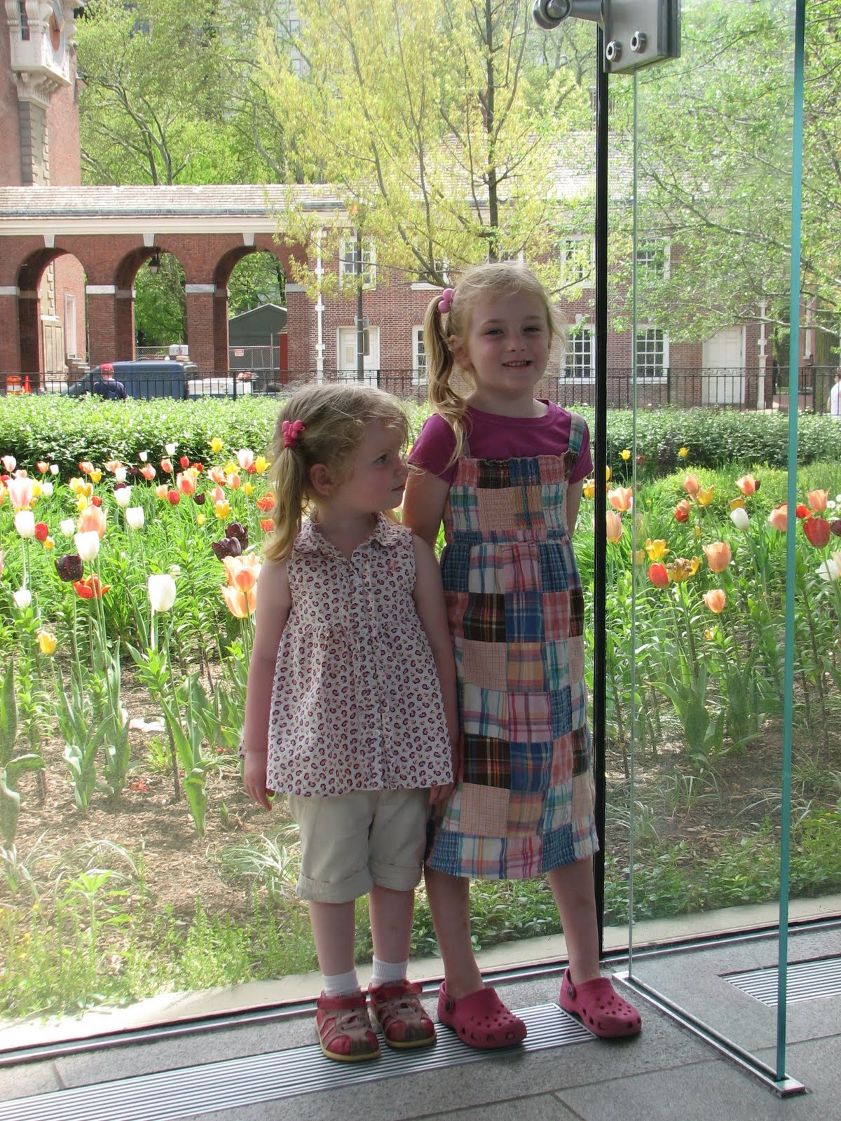 After the morning at our homeschool co-op, we spent the day in Philly. Naturally, we visited the Liberty Bell, Ben Franklin's Court and Penn's Landing. The girls acted like seasoned tourists and totally ignored the Liberty Bell-the floor to ceiling glass windows were WAY more exciting!